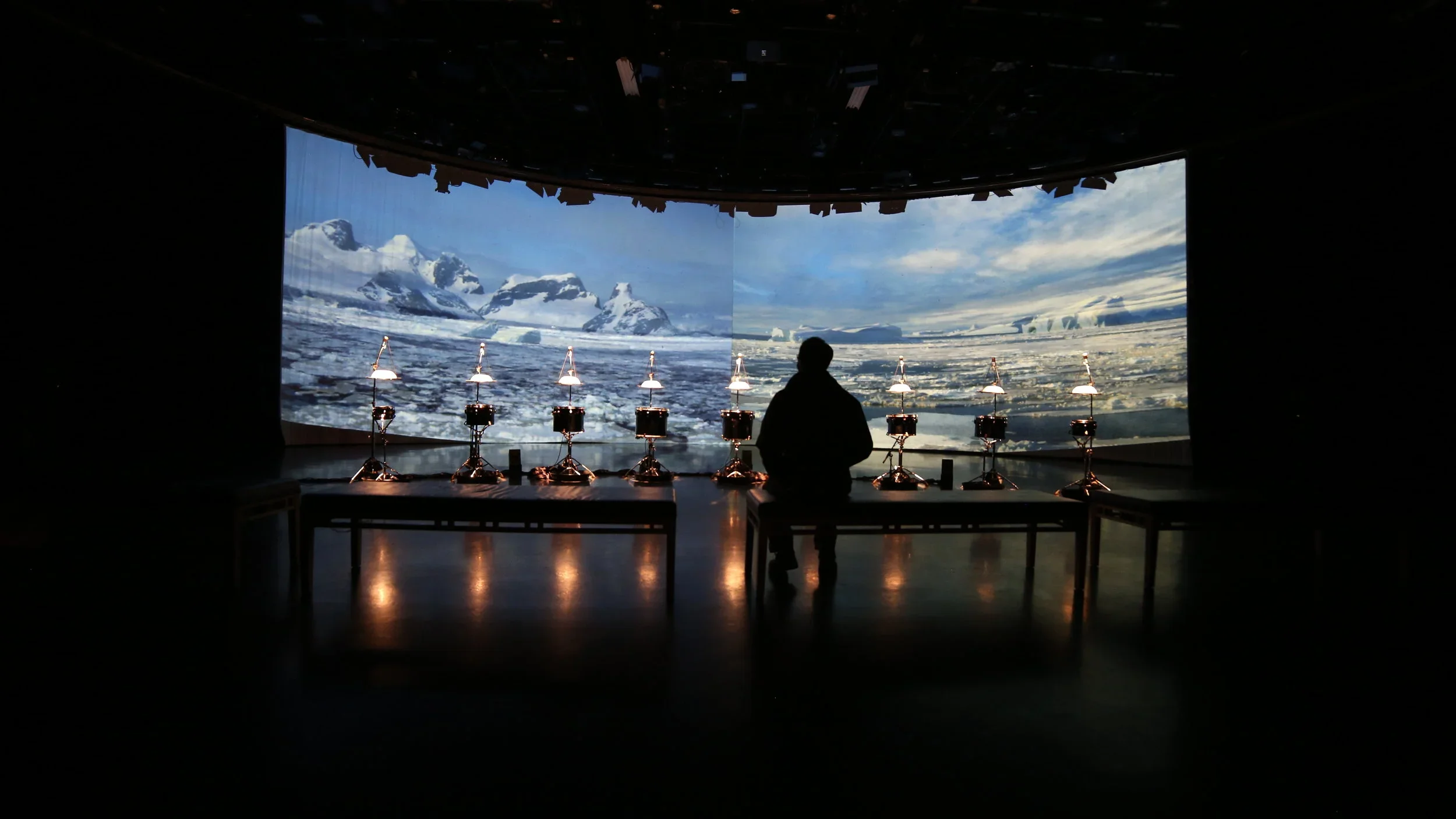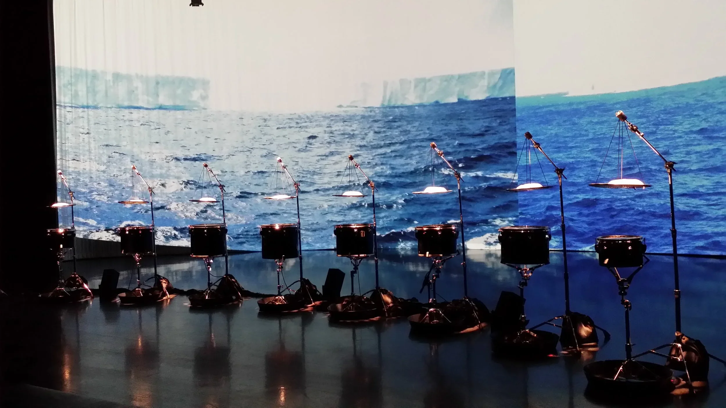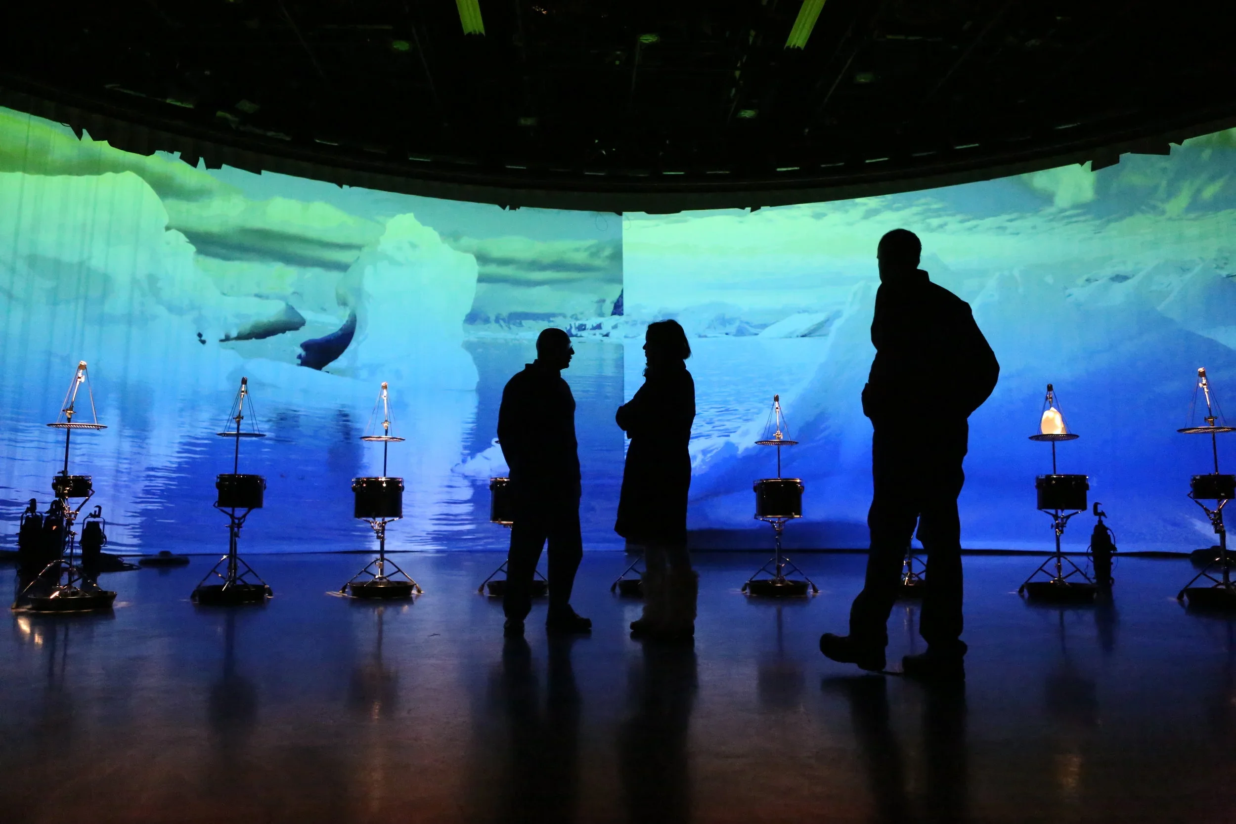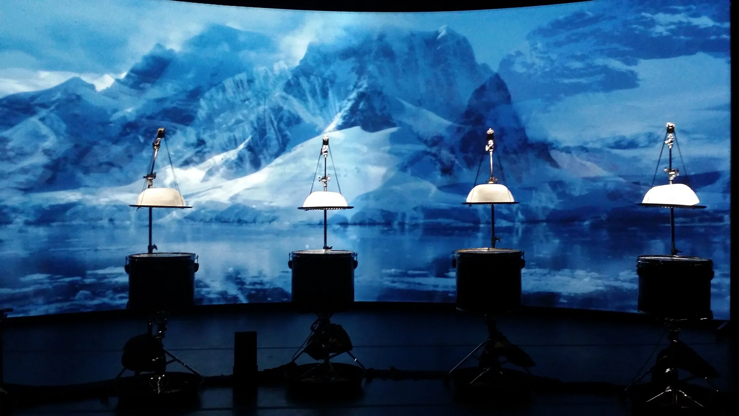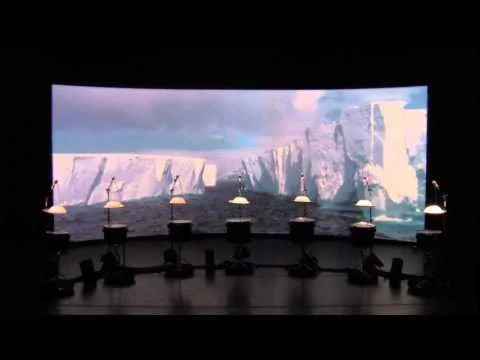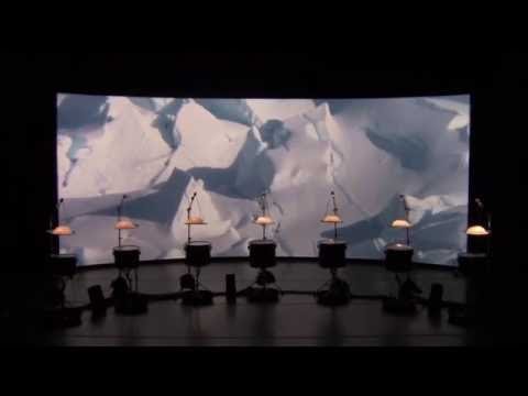 The collaboration takes its inspiration from Henry Pollack’s book A World Without Ice. An original composition by Stephen Rush, with musical patterns and structure derived from a century of climate data, anchors the installation. An innovative ice-melt actuated instrument created by Michael Gould, comprising suspended ice domes melting drip-by-drip onto an array of differently tuned drums, complements Rush’s score. A film by Marion Tränkle blends beautiful photographs from both the Arctic and Antarctic by Pollack and his colleagues, to provide a gorgeous, slowly evolving large-scale visual envelope for the installation. The musical composition carries the listener through large leaps in temperature, the randomly dripping ice yields an eerily beautiful and natural companion sound, and the film provides a stunning visual immersion. The overall narrative of the imagery takes the viewer from a totality of ice, slowly evolving into landscapes of ice, land and water, eventually to reach an enveloping ocean that characterizes Earth without ice.
