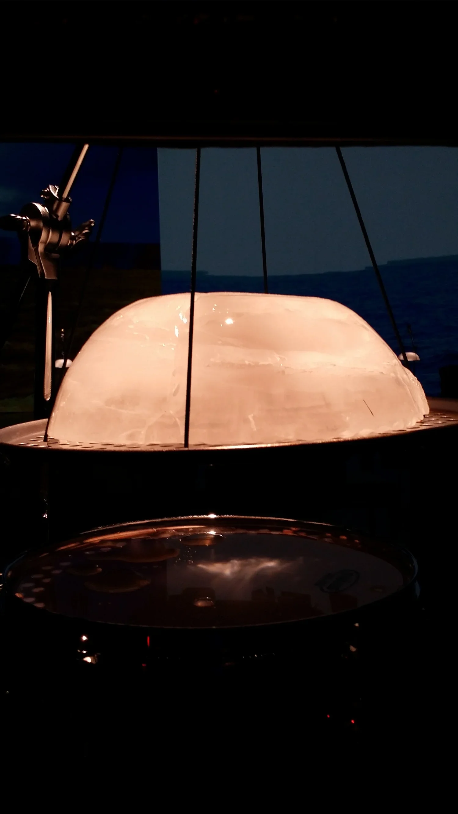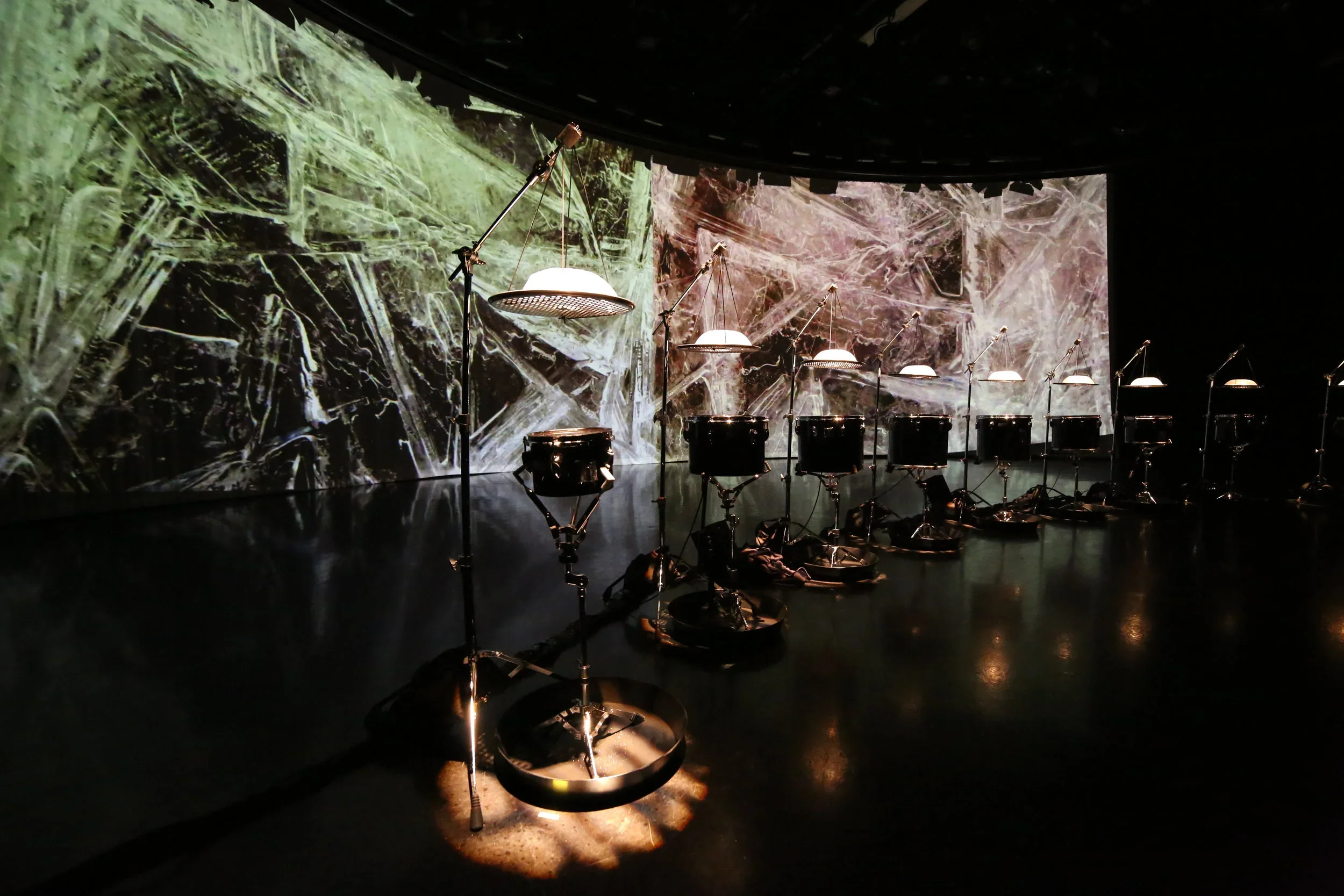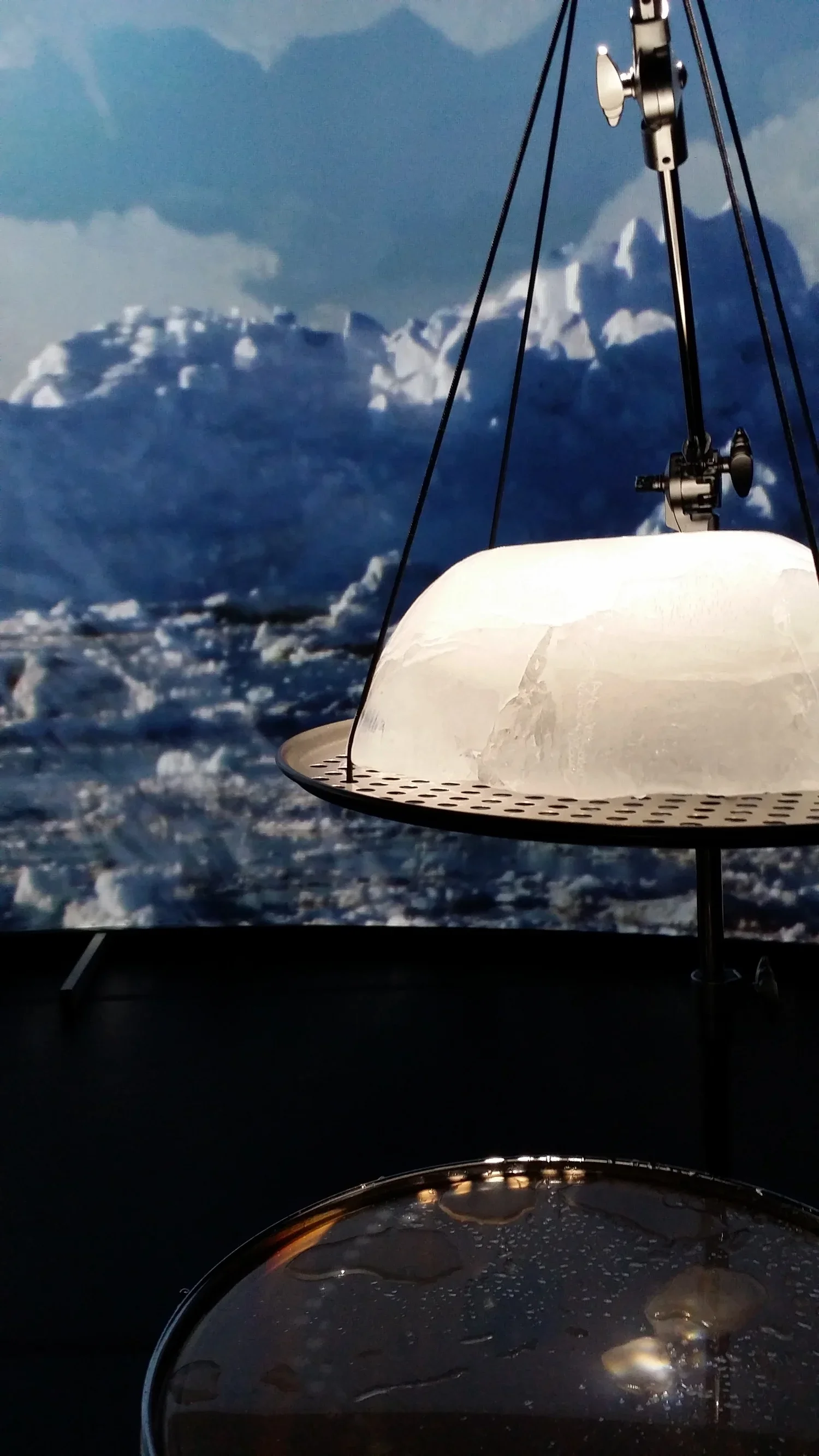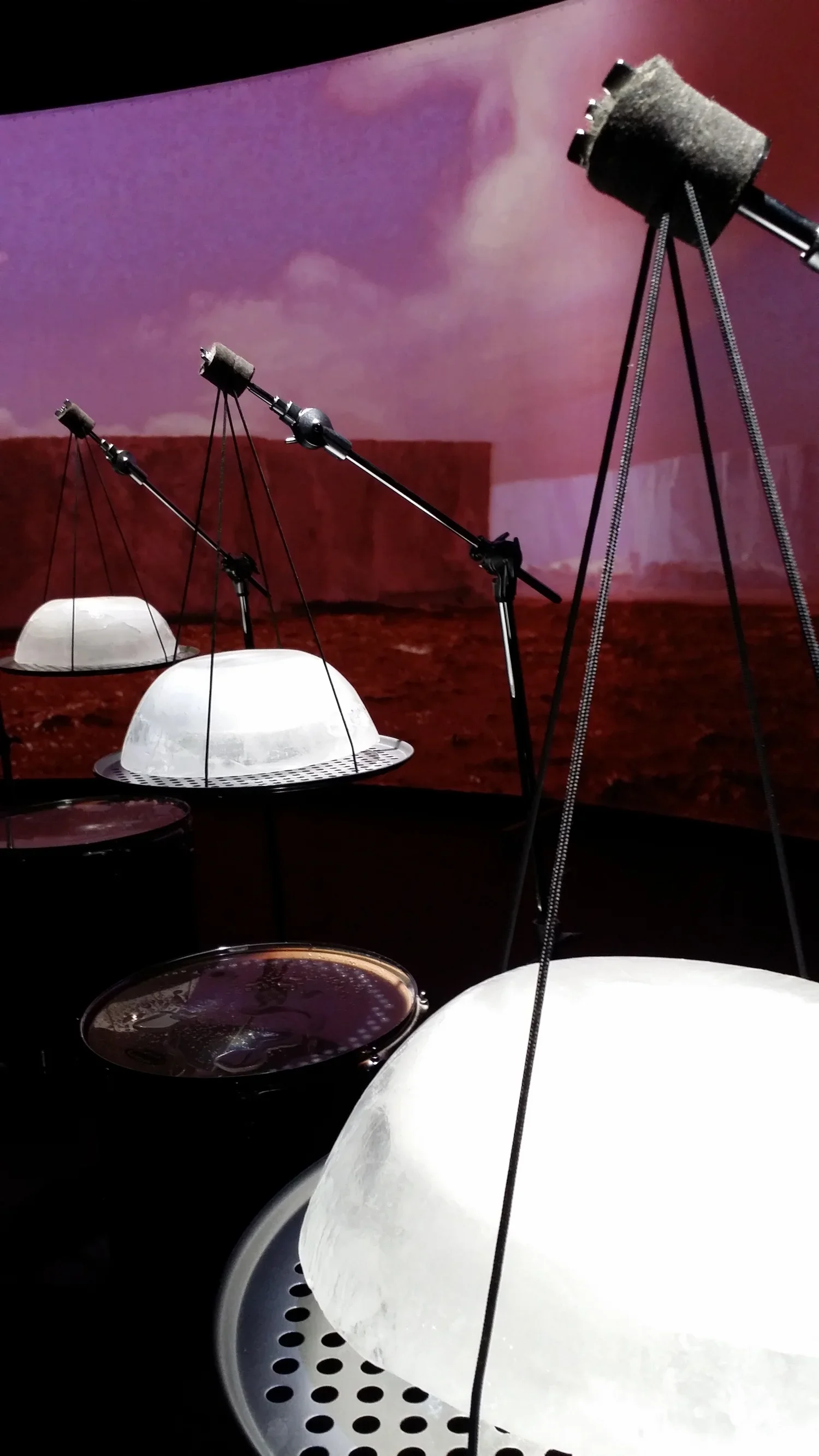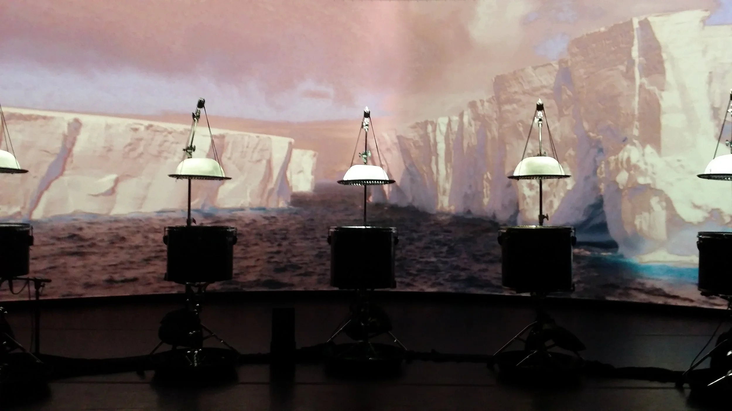 The collaboration takes its inspiration from Henry Pollack’s book A World Without Ice. An original composition by Stephen Rush, with musical patterns and structure derived from a century of climate data, anchors the installation. An innovative ice-melt actuated instrument created by Michael Gould, comprising suspended ice domes melting drip-by-drip onto an array of differently tuned drums, complements Rush’s score. A film by Marion Tränkle blends beautiful photographs from both the Arctic and Antarctic by Pollack and his colleagues, to provide a gorgeous, slowly evolving large-scale visual envelope for the installation. The musical composition carries the listener through large leaps in temperature, the randomly dripping ice yields an eerily beautiful and natural companion sound, and the film provides a stunning visual immersion. The overall narrative of the imagery takes the viewer from a totality of ice, slowly evolving into landscapes of ice, land and water, eventually to reach an enveloping ocean that characterizes Earth without ice.